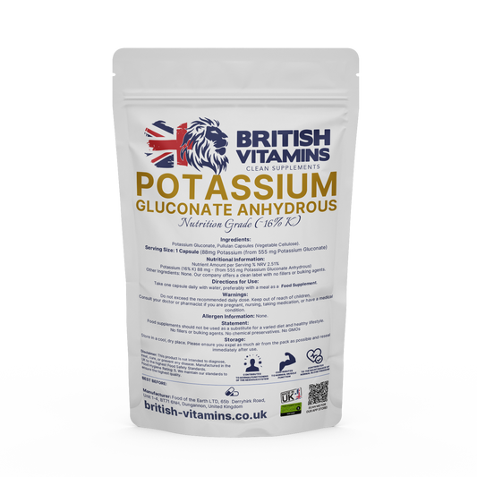 Potassium Gluconate Capsules – 88mg Elemental Potassium (from 555mg Gluconate)Potassium Gluconate Powder – 250g – Pure Electrolyte Support (~16% Potassium) – Vegan, Additive-Free, UK Made